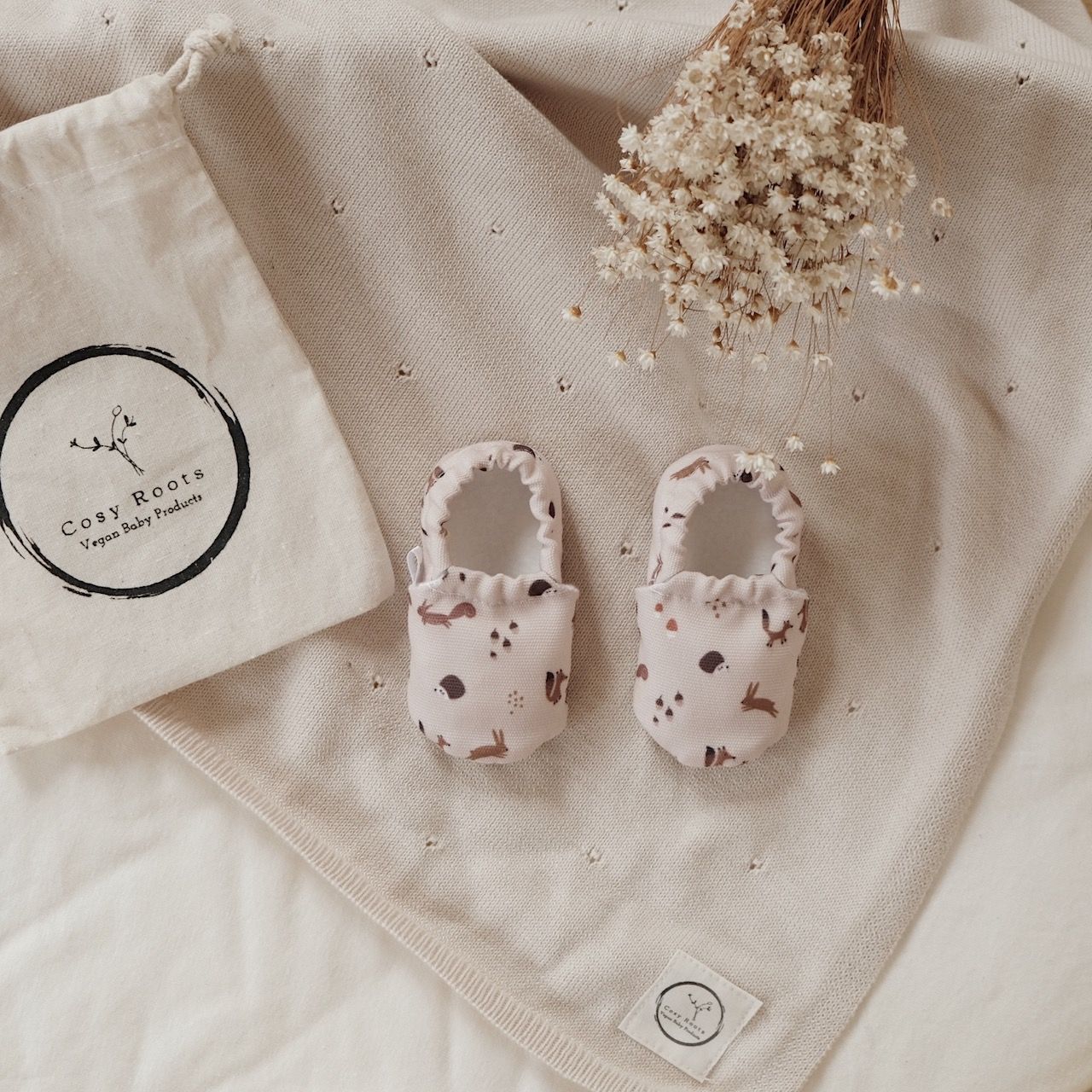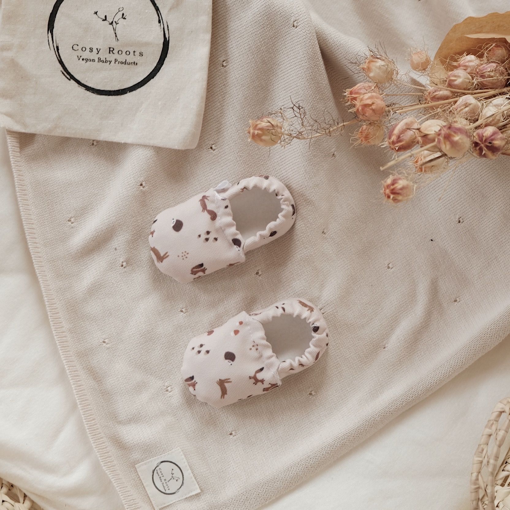 It´s Cuddle-Time! Was gibt es süßeres als 100% vegane Schuhe mit wundervollen Waldtieren in einem schönen Creme-Ton (je nach Lichteinfall geht der Ton ganz leicht ins rosa). Schnapp´ Dir dieses Paar bevor es weg ist. Die nachhaltigen Schuhe passen sich optimal Deinen Füßen an und fördern Deine gesunde Entwicklung. Es ist fast wie barfußlaufen nur mit dem Schutz aus samtweichen und recycelten Materialien.